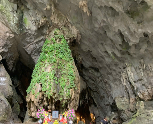 🕍 Un ensemble sacré de temples et de grottes Arrivé au pied des montagnes Hương Sơn, le pèlerin peut emprunter un sentier bordé de marches de pierre ou prendre le téléphérique pour rejoindre le cœur du complexe. La Pagode Thiên Trù (Pagode du Ciel du Ciel), construite au XVe siècle sous la dynastie des Lê, accueille les visiteurs avec sa grande tour octogonale et son atmosphère paisible. C’est le point de départ du pèlerinage. Mais le lieu le plus sacré reste la Grotte Hương Tích, souvent surnommée “Nam Thiên Đệ Nhất Động” – « La plus belle grotte du Sud du ciel ». Pour y accéder, il faut gravir plusieurs centaines de marches de pierre à travers la forêt. À l’entrée de la grotte, une inscription ancienne datant du roi Lê Thánh Tông (XVᵉ siècle) proclame : “Nam Thiên Đệ Nhất Động” – « La première grotte sous le Ciel du Sud ». À l’intérieur, les stalactites et stalagmites prennent des formes mystérieuses, interprétées comme des symboles de prospérité et de fertilité. Des autels dédiés à la déesse Quan Âm (Avalokiteśvara) y sont vénérés, et l’air embaume d’encens et de ferveur. 🌸 Le grand festival de Chùa Hương De janvier à mars lunaire, la Pagode des Parfums devient le théâtre du plus grand pèlerinage bouddhique du Vietnam. Des dizaines de milliers de fidèles affluent de tout le pays pour prier pour la santé, la chance et la prospérité. Les chants, les prières, les offrandes et les marchés improvisés animent les sentiers et les rives du suối Yến. C’est une immersion exceptionnelle dans la culture spirituelle vietnamienne, mêlant ferveur religieuse et convivialité populaire.