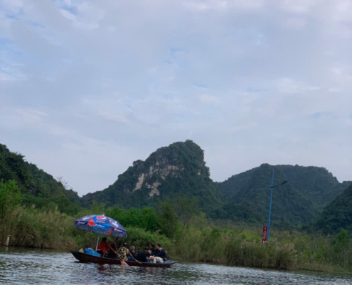 🏞️ Un sanctuaire caché au cœur de la nature Le parcours vers la Pagode des Parfums est une véritable aventure. Depuis le petit embarcadère de Bến Đục, les visiteurs embarquent sur une barque en aluminium ou en bois pour une croisière poétique de près d’une heure sur la rivière Yến (suối Yến). La rivière serpente entre des collines karstiques et des champs de riz paisibles, créant un tableau d’une douceur rare, surtout au printemps lorsque les fleurs de montagne éclosent sur les berges. Le clapotis de l’eau et le chant des oiseaux accompagnent le visiteur dans ce voyage spirituel.