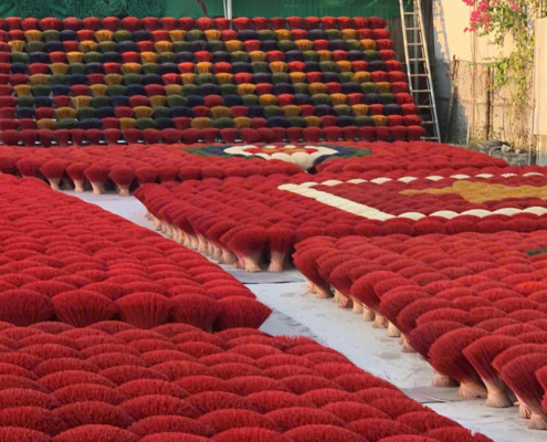 Au lever du soleil, le village s’éveille dans une explosion de teintes éclatantes : rouge, rose, violet, parfois doré. Les bâtonnets d’encens fraîchement teintés sont disposés en gerbes rondes pour sécher sous la lumière du jour. De loin, ces bouquets forment un véritable tableau vivant, que les photographes du monde entier viennent immortaliser.
