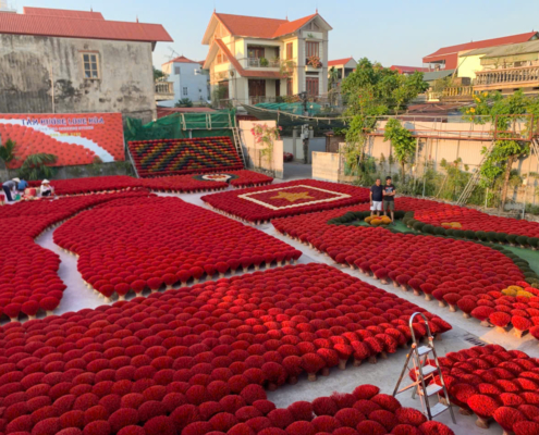 À une trentaine de kilomètres au sud de Hanoï, niché dans le district de Ứng Hòa, se trouve un village hors du temps : Quảng Phú Cầu, le célèbre village de l’encens du Vietnam. Ici, l’air est imprégné d’un parfum doux et mystique, et les couleurs rouges éclatantes des bâtonnets d’encens s’étendent à perte de vue, comme un océan de fleurs sous le soleil.