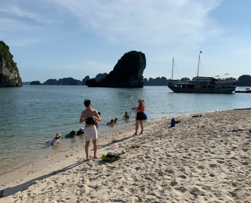 Se promener en bateau au milieu de Bái Tử Long, c’est plonger dans une atmosphère presque irréelle. Parfois, le silence est si profond qu’on n’entend que le bruit discret de l’eau contre la coque. D’autres fois, ce sont les cris des mouettes qui accompagnent la traversée. À chaque détour, une surprise : une crique déserte, une plage immaculée, une grotte mystérieuse qui invite à l’exploration.